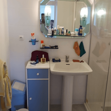 The bathroom needed a complete overhaul with new piping, smarter layout, updated tiling, and modern fixtures. A gorgeous glass, walk-in shower was installed with a free-standing sink alongside.